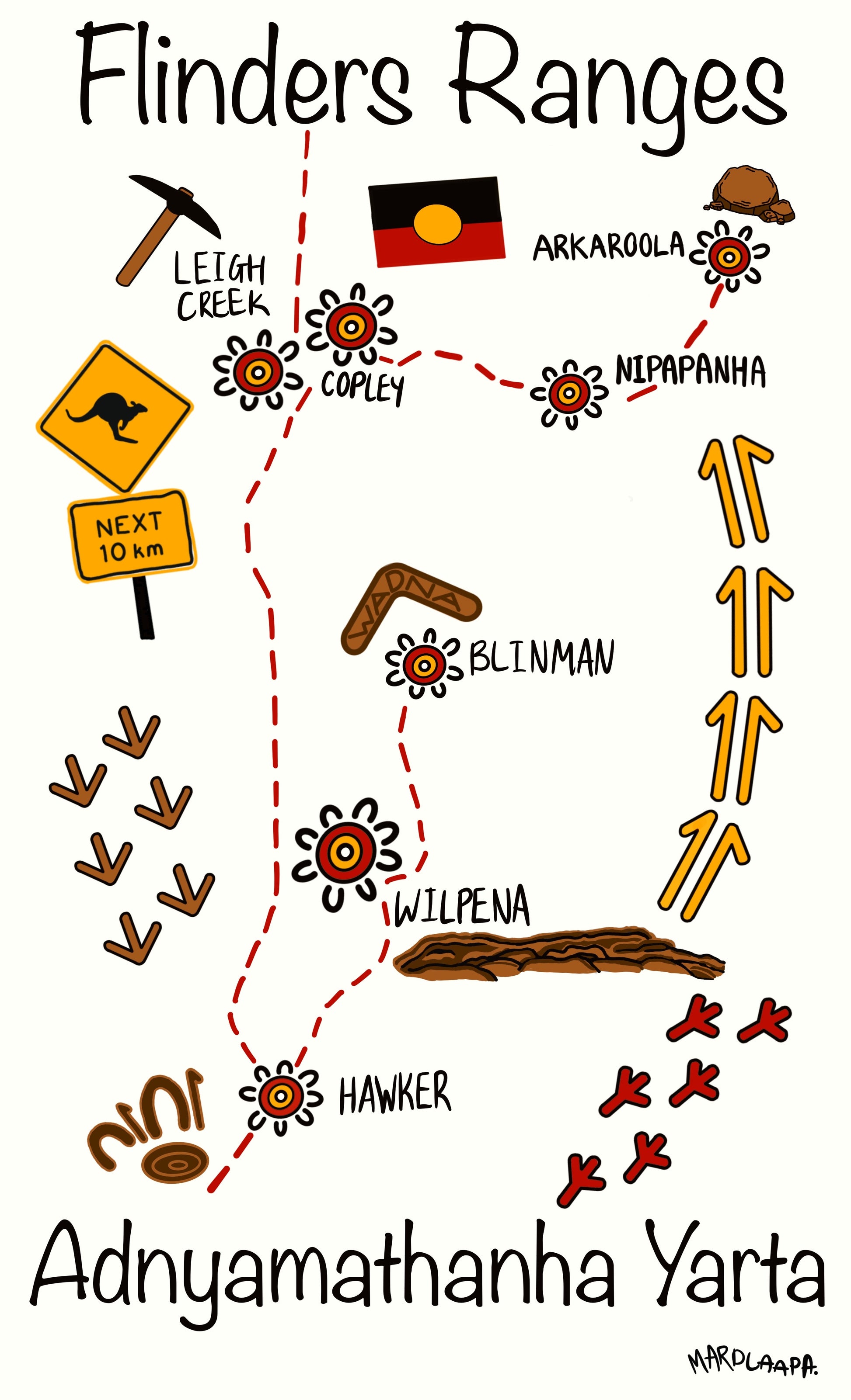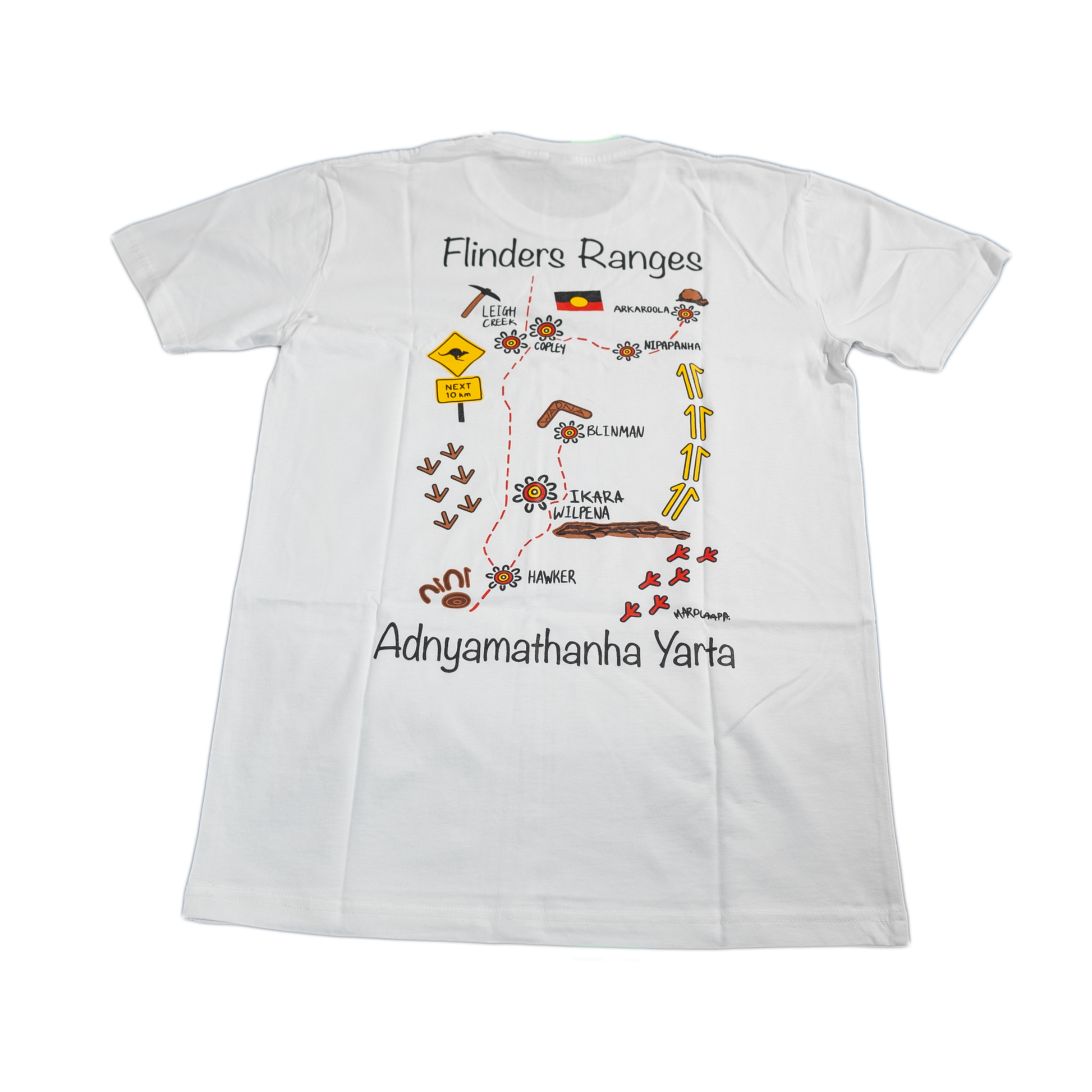 Included on the back is a detailed map of the Adnyamathanha Yarta in the Flinders Ranges, showcasing not only its geographical features but also highlighting major towns and cultural sites nestled within its lands. From Central to Northern Flinders Ranges the map includes landmarks such as Ikara - Wilpena Pound and towns such as Hawker, Blinman and Nipapanha.