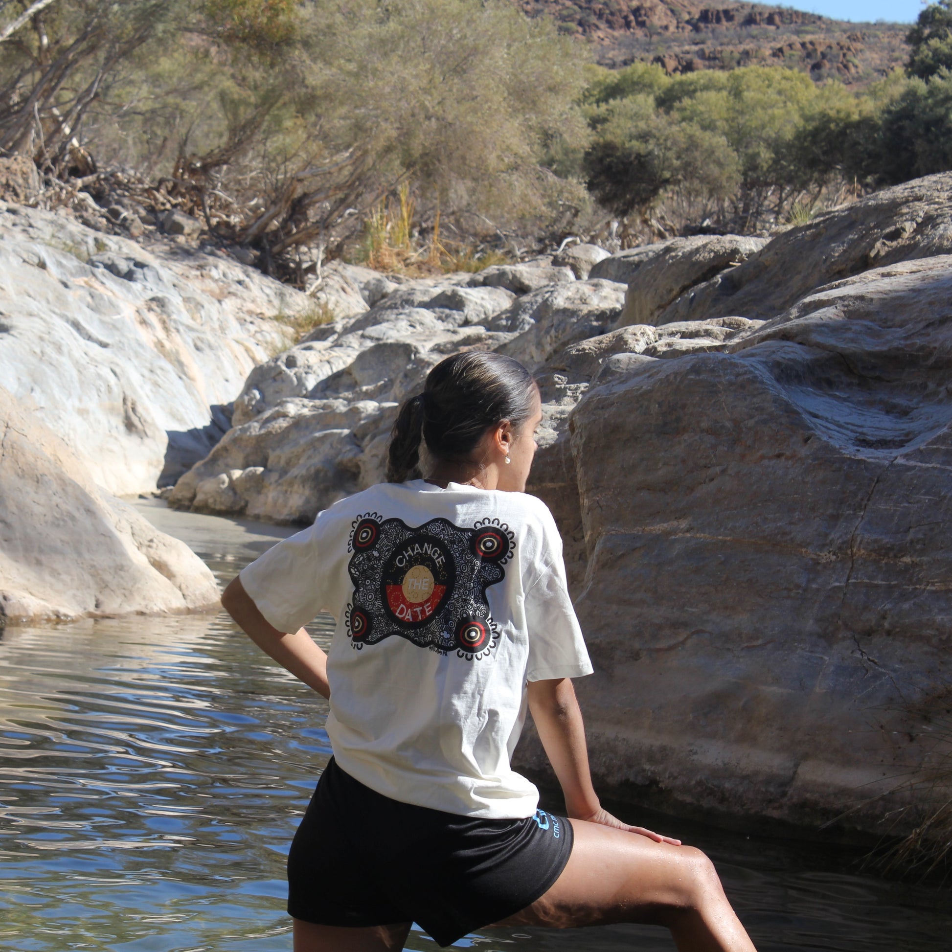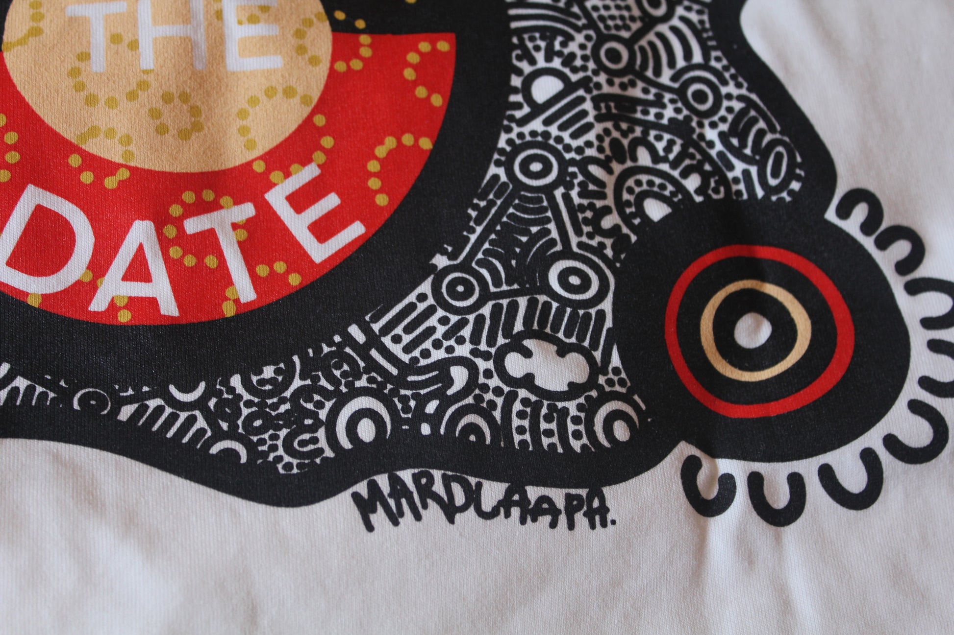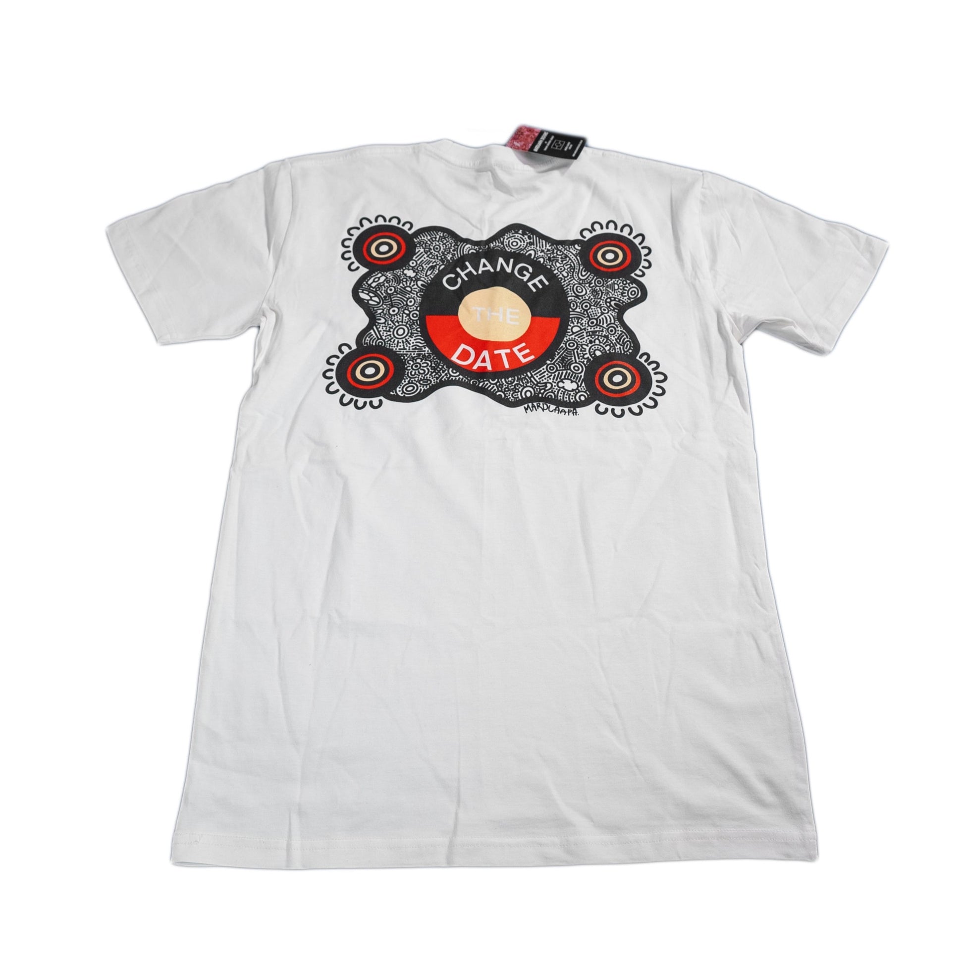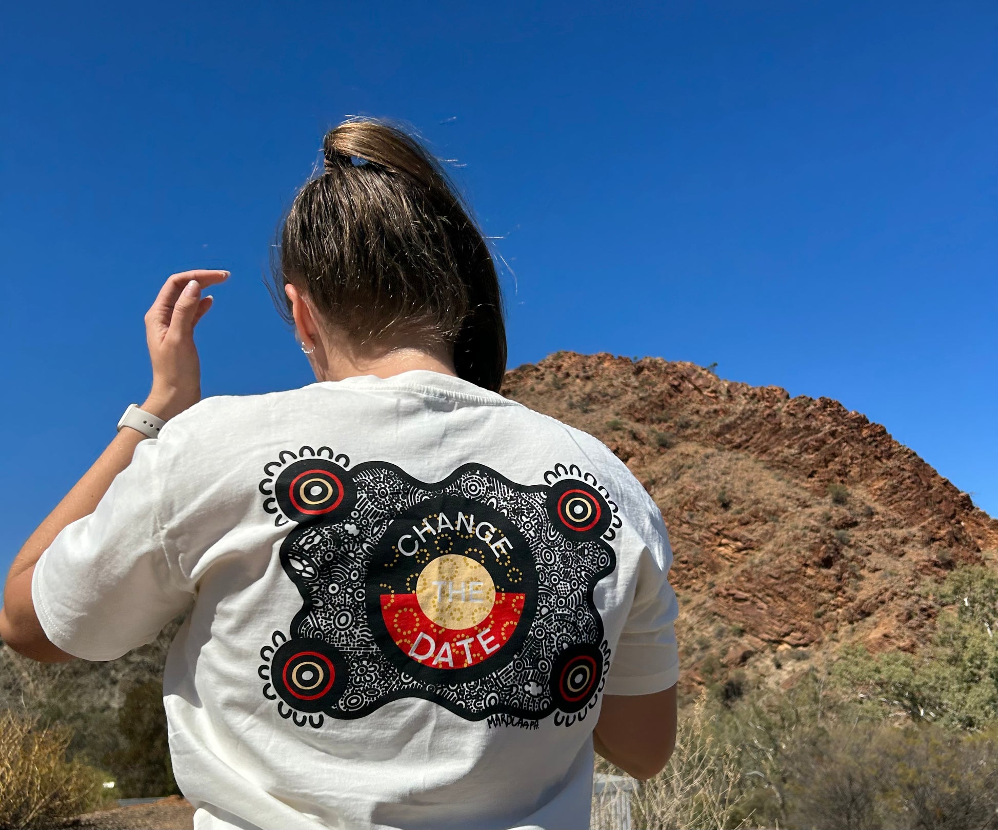 Make a statement with our "Change the Date" T-Shirt, a powerful and bold way to show your support for changing the date of Jan 26. The front of this t-shirt features the words "Change the Date" which sits just above the heart and the back of the t-shirt has a contemporary Aboriginal designs also with these key three words.