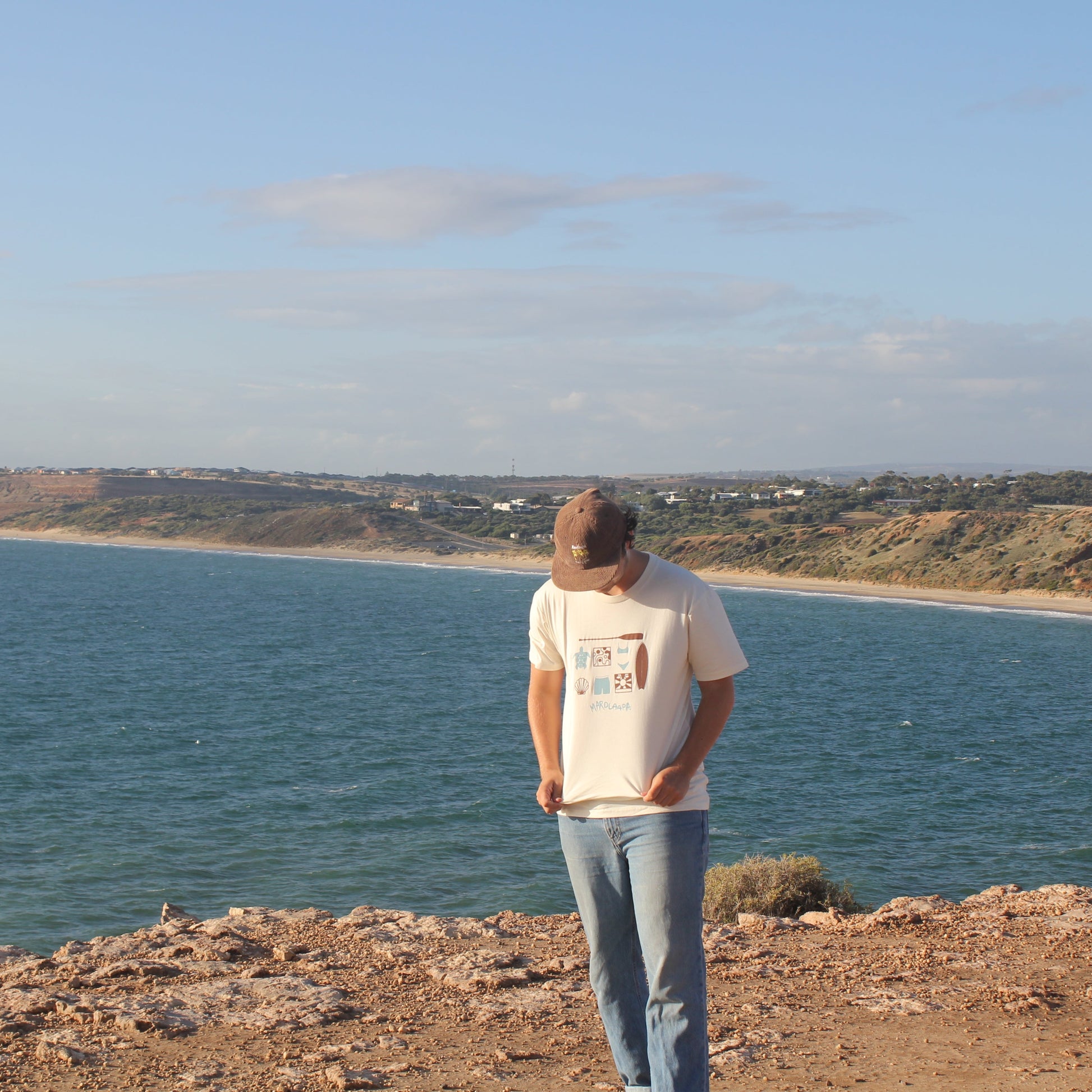 Get ready to roll down to the beach or your favourite coffee shop with with our "Coastal Collection" T-Shirt! This comfortable and stylish tee features a range of ocean oriented items portrays a relaxed graphic that reminds you of your time at the beach. Printed onto a light cream t-shirts with a light blue and deep brown design this tee catches eyes wherever it wanders. This tee is also perfect for showing off your love for beach culture and the ocean.
